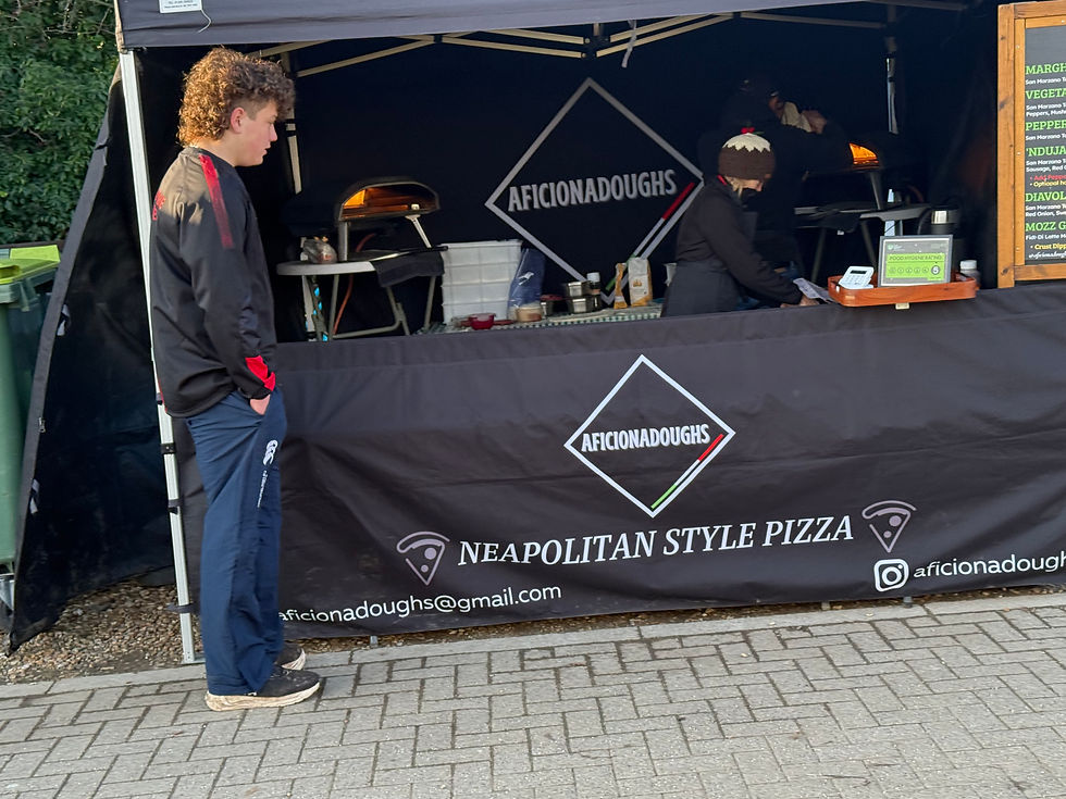 Both predictably skipped the indoor fayre and headed straight for the pizza, although Holly was quite tempted by the hog roast. Unfortunately, they both had to wait 40 minutes for their orders as they were initially forgotten and then overlooked as kickoff approached and the line grew longer. Worse still, orders were still being taken even though, according to the lady handling the payments, there was uncertainty about having enough ingredients to fulfill them! An order number was issued, but with no ticket given, people were simply claiming a pizza as theirs if it had the right toppings.